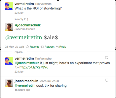 To reach beyond my grey brain cells, I fired “What is the ROI of Business Storytelling” at the crowd. And yes, there it was: @joachimschulz noticed the question and replied – quite convinced – $ale$.